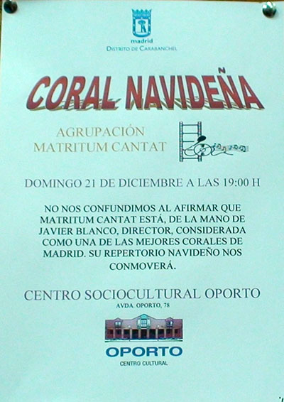 Concierto de Navidad en el distrito de Carabanchel 21 diciembre, 2008 Matritum Cantat dió un concierto de Navidad en el Centro sociocultural de Oporto. Share on Tumblr Relacionado: Concierto Centro Cultural Buero Vallejo Concierto de Navidad – San Ginés Concierto de Navidad – Parroquia de los Santos Inocentes Concierto de Navidad – San Antonio María Zacaria