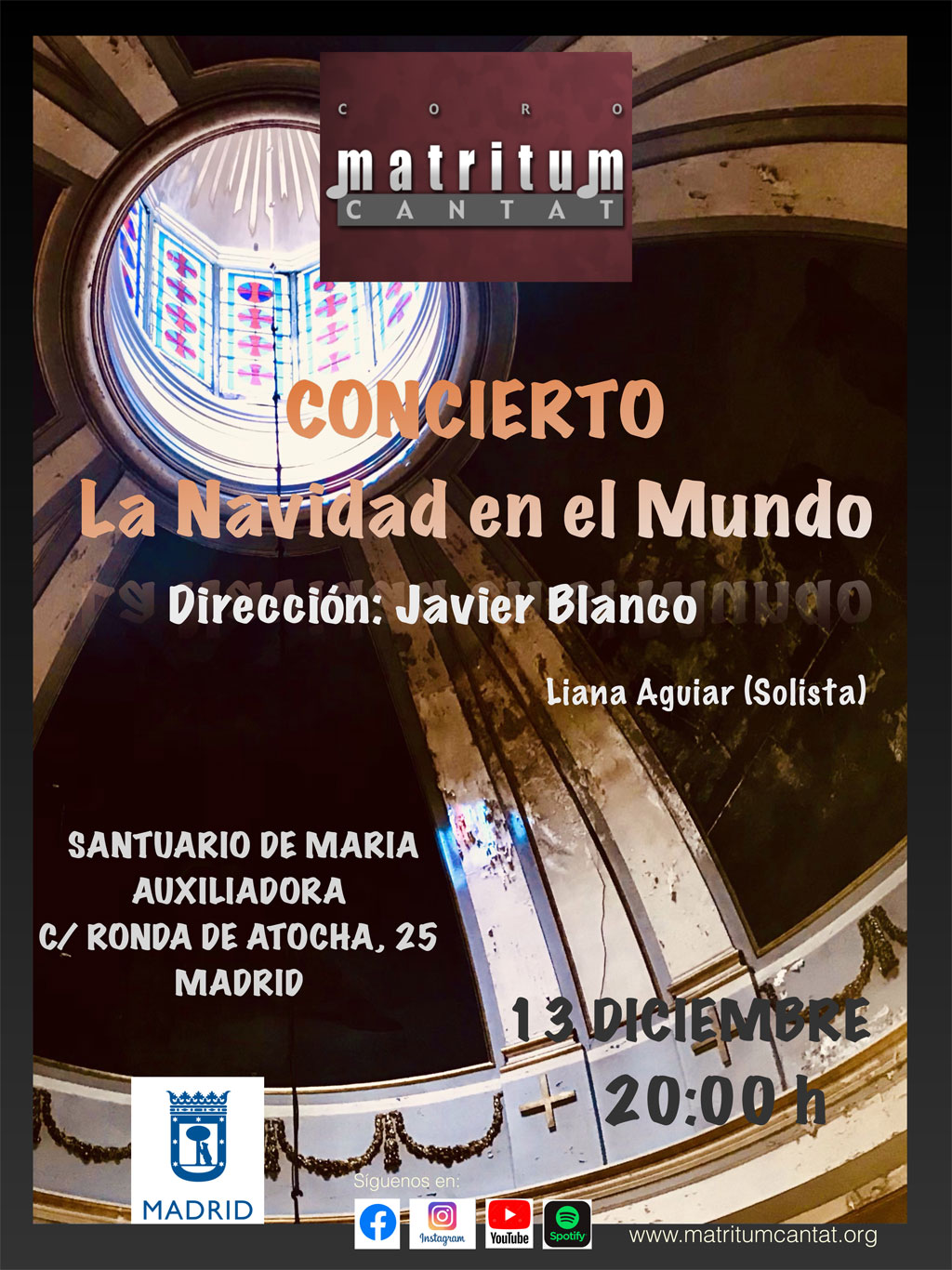 Concierto Matritum Cantat – La Navidad en el Mundo Fecha y hora: Miércoles, 13 dic 202320:00 Lugar:María Auxiliadora Ronda de Atocha, 25 Madrid Cargando mapa.... María AuxiliadoraRonda de Atocha, 25 - MadridEventos 40.4061725 -3.6979886000000306