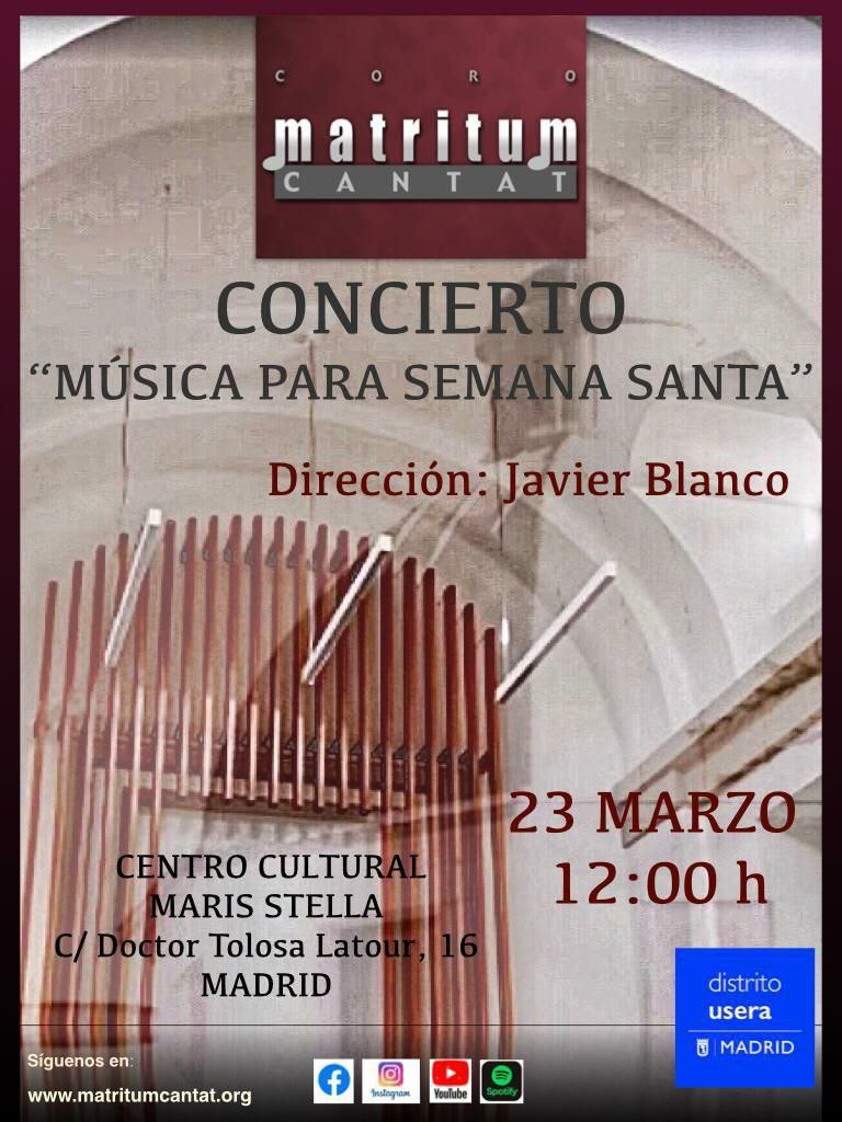 Concierto Matritum Cantat – Música para semana santa Fecha y hora: Sábado, 23 mar 202412:00 Lugar:Iglesia Maris Stella Calle del Dr. Tolosa Latour, 16A Madrid Mapa no disponible
